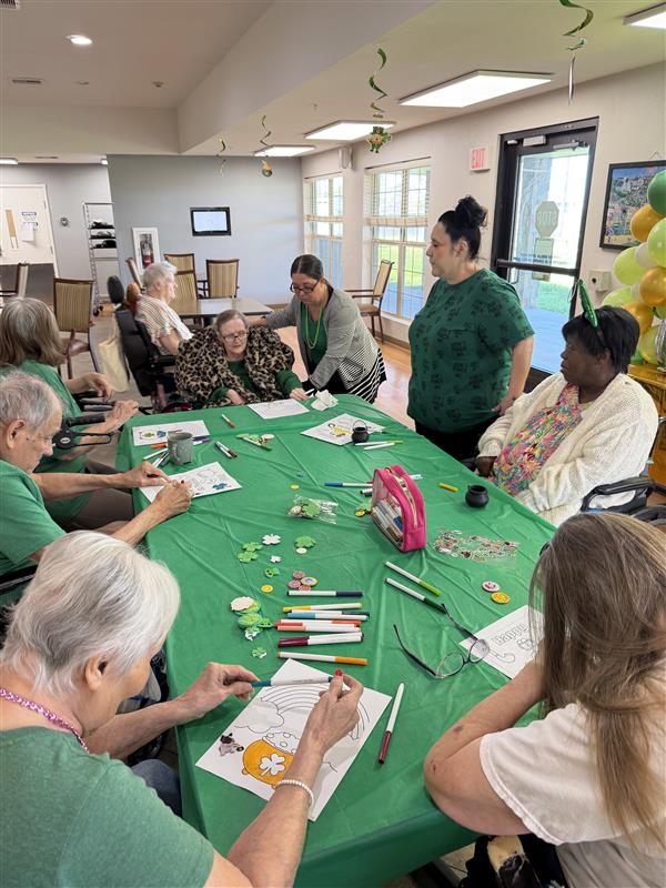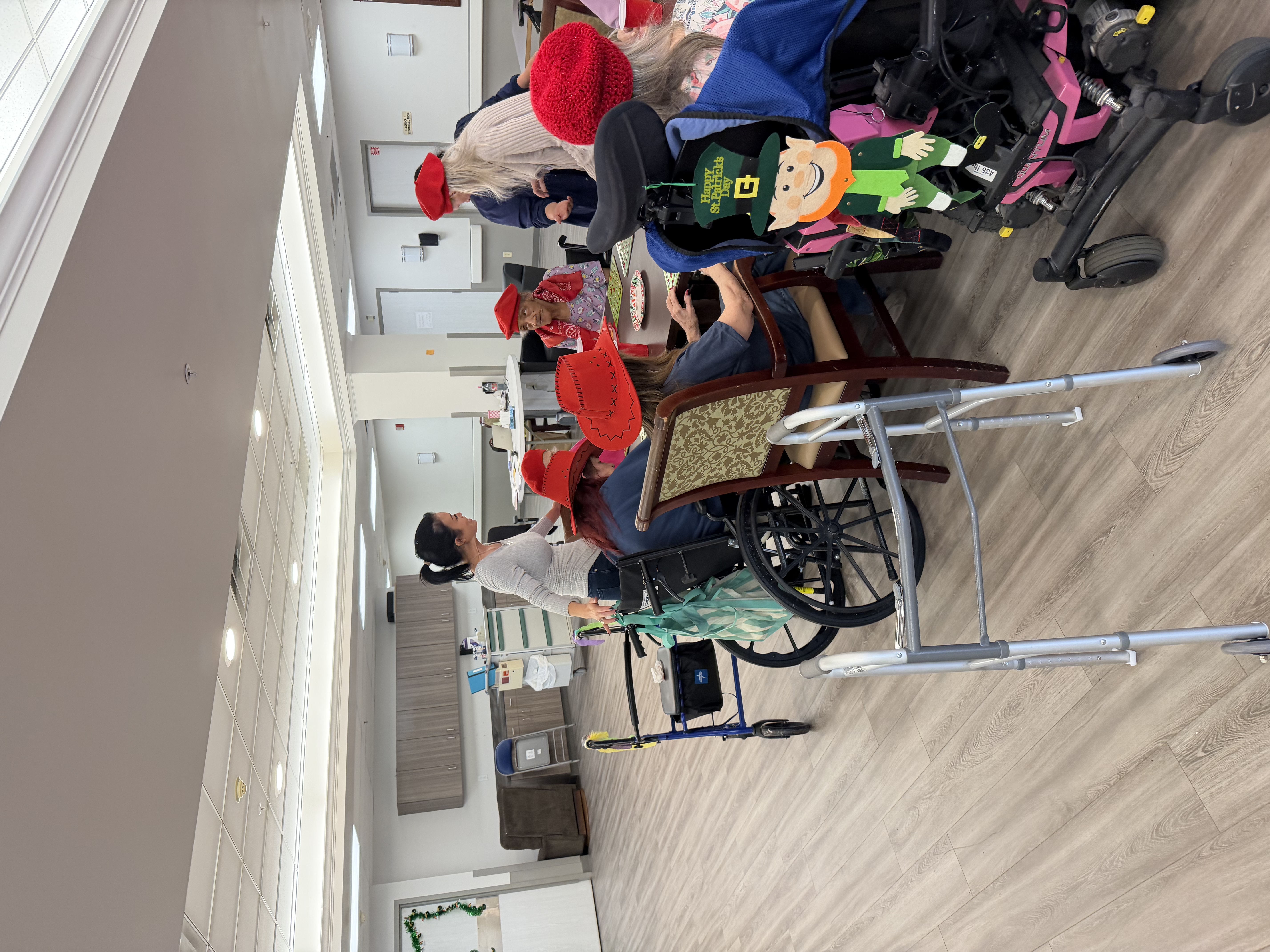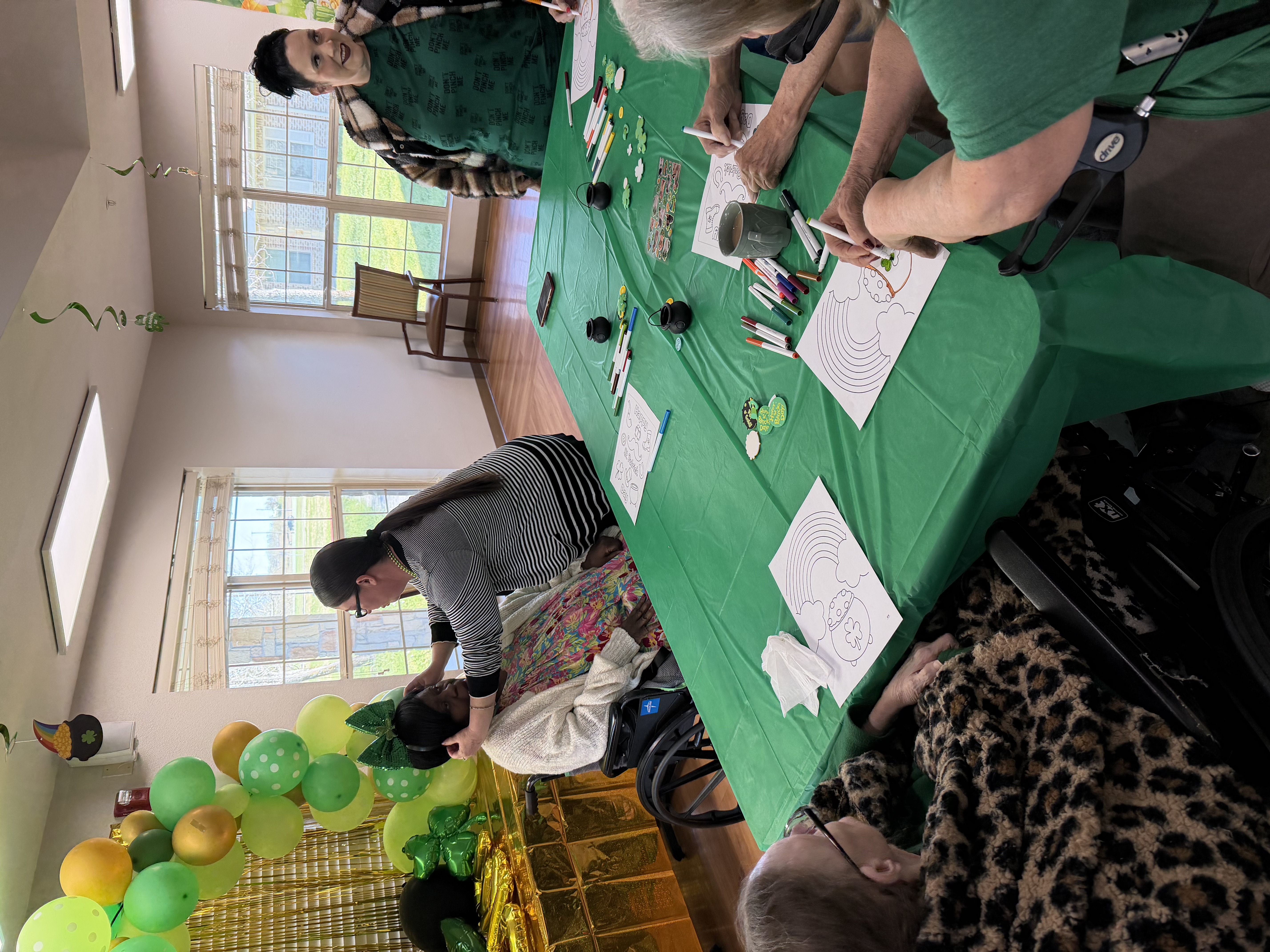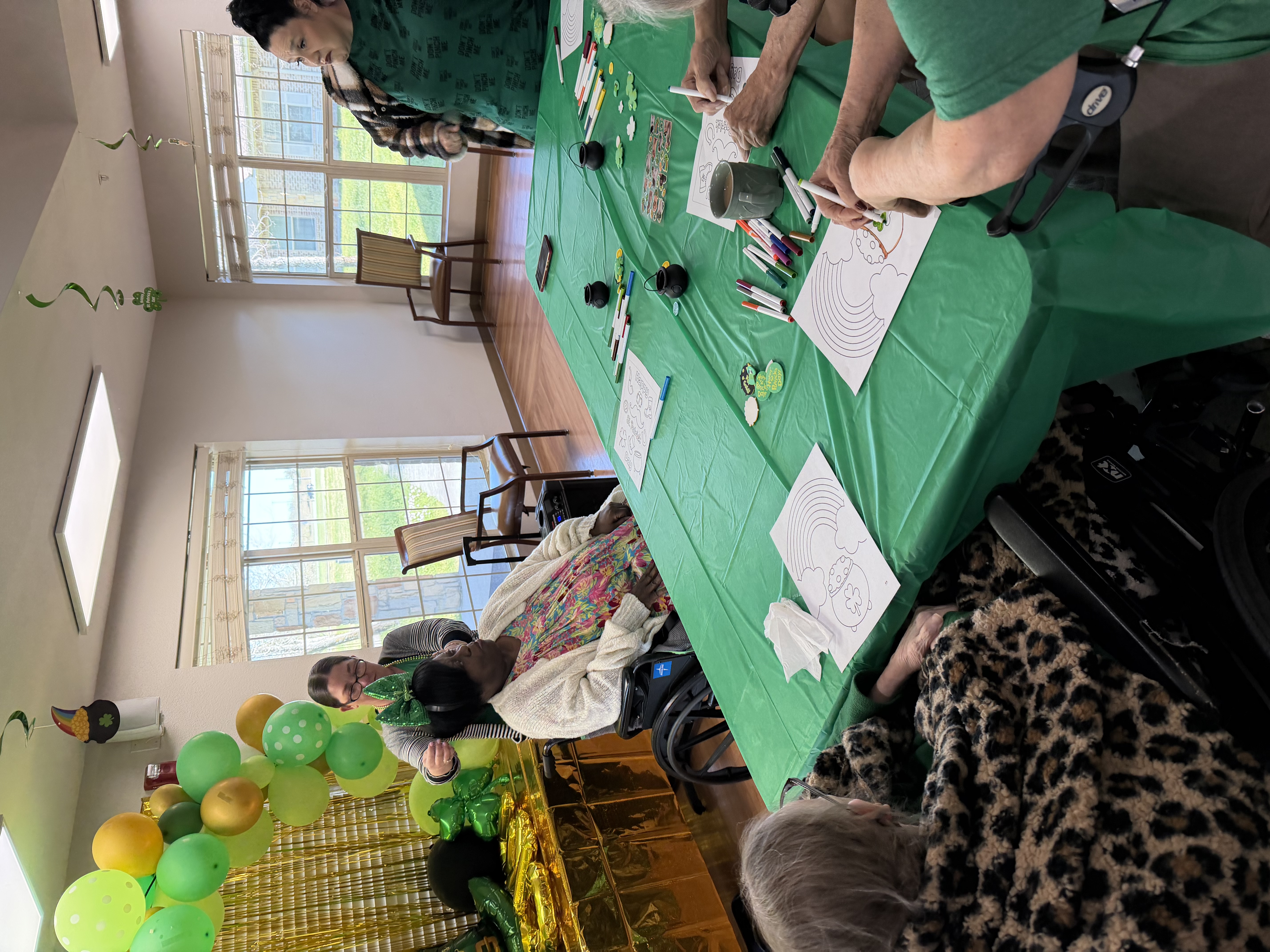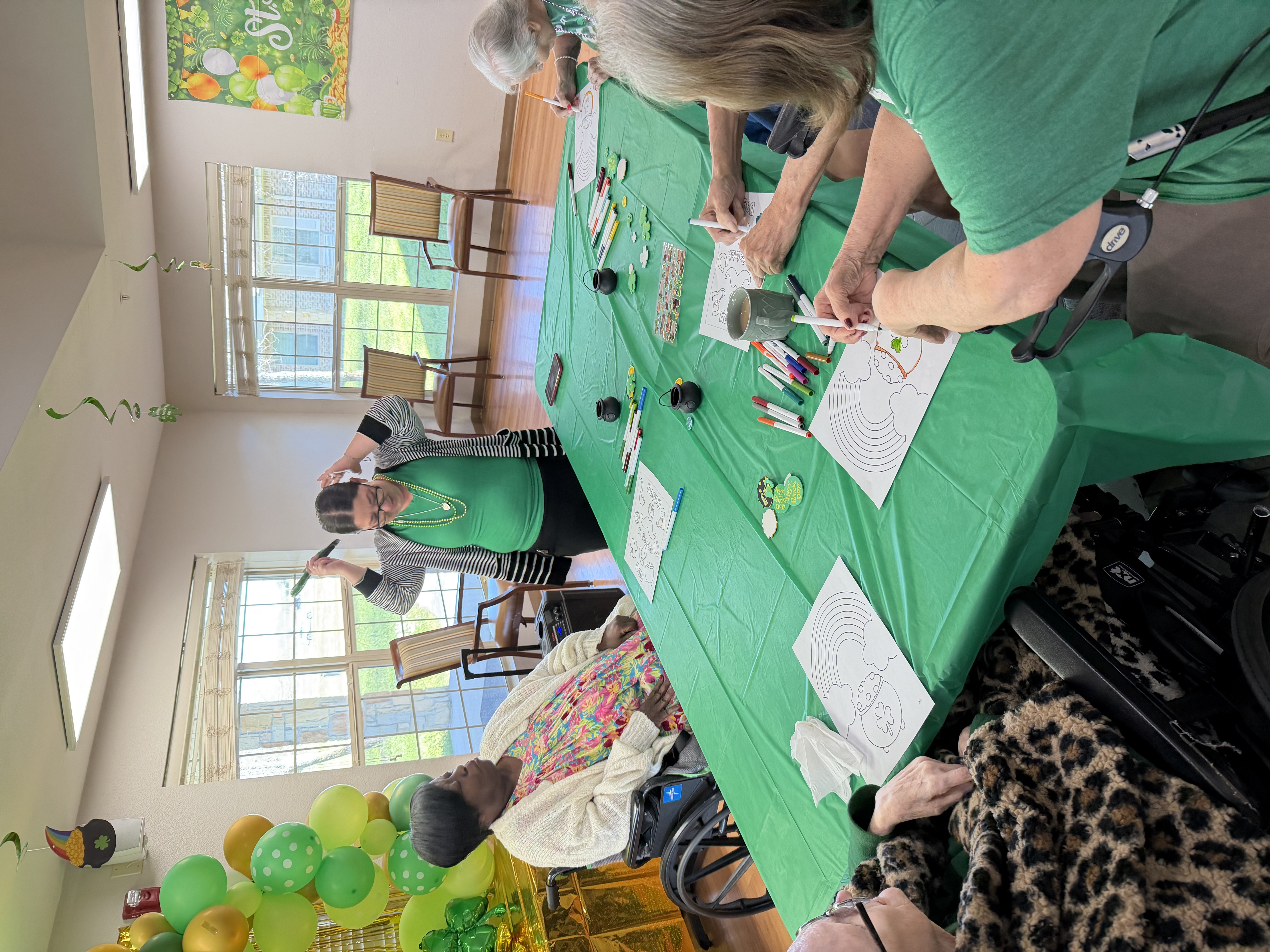 St. Patrick’s Day brought another setup. Green decorations, crafts, and a room that slowly filled with conversation.